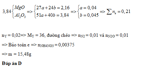 Cho 2,16 gam hỗn hợp gồm Al và Mg tan hết trong dung dịch axit HNO3 loãng, đun nóng nhẹ tạo ra dung dịch X và 448 ml (đo ở 354,90 K và 988 mmHg) hỗn hợp khí Y khô gồm 2 khí không màu, không đổi màu trong không khí. Tỷ khối của Y so với oxi bằng 0,716 lần tỷ khối của khí cacbonic so với nitơ. Làm khan X một cách cẩn thận thu được m gam chất rắn Z, nung Z đến khối lượng không đổi thu được 3,84 gam chất rắn T. Giá trị của m là