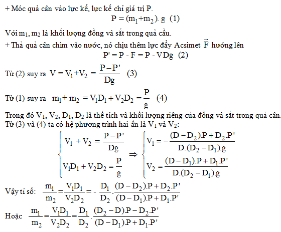 Cho rằng đã biết khối lượng riêng của nướclà D, của đồng là D1và của sắt là D2.