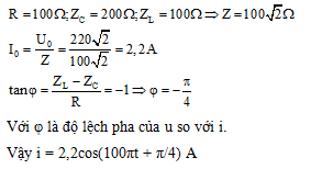 cos100πt (V) vào hai đầu đoạn mạch mắc nối tiếp gồm điện trở R = 100Ω, tụ điện có C = 10-4/2π (F) và cuộn cảm thuần có L = 1/π (H). Biểu thức cường độ dòng điện trong đoạn mạch là