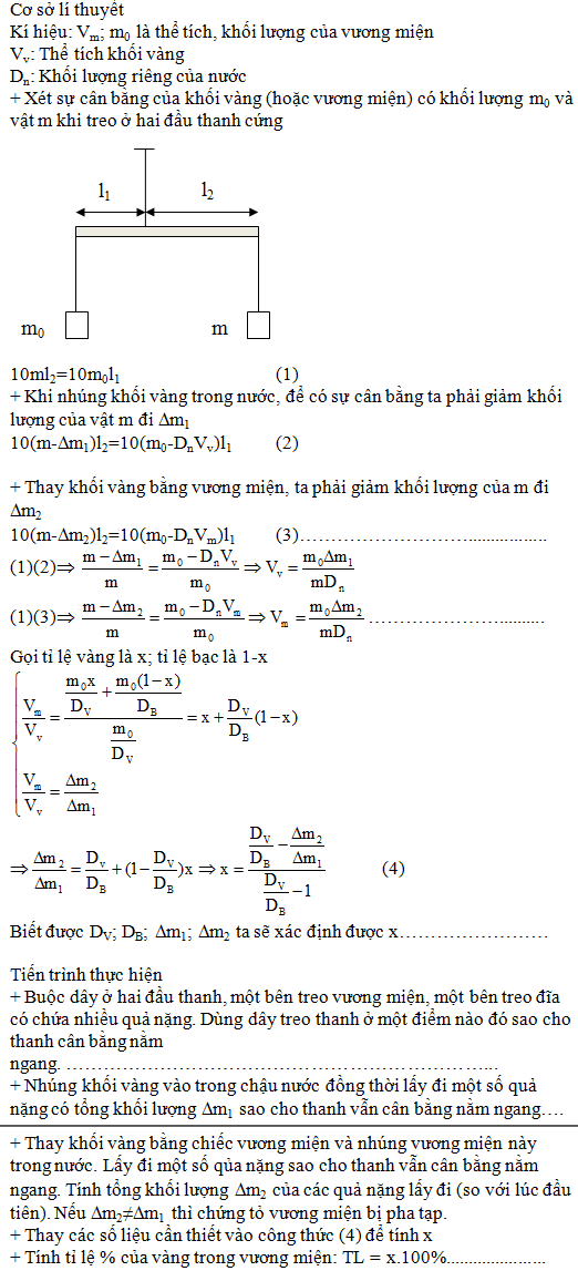Yêu cầu: Nêu cơ sở lí thuyết, trình tự tiến hành làm thí nghiệm để xác định tỉ lệ phần trăm khối lượng vàng trong chiếc vương miện mà không làm hỏng vương miện.