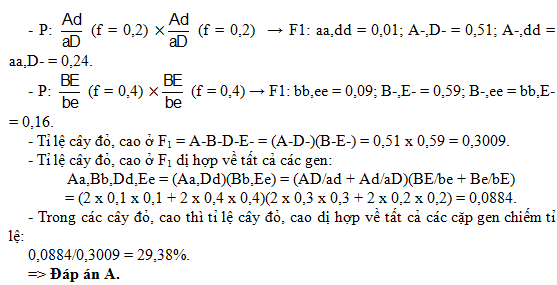 . Nếu tần số hoán vị gen 2 giới là như nhau và tần số hoán vị gen A và d là 20%; tần số hoán vị gen giữa B và E là 0,4 thu được F1.Tính theo lý thuyết, ở đời F1, trong số cây quả đỏ, thân cao thì cây quả đỏ, thân cao dị hợp về tất cả các cặp gen chiếm tỉ lệ: