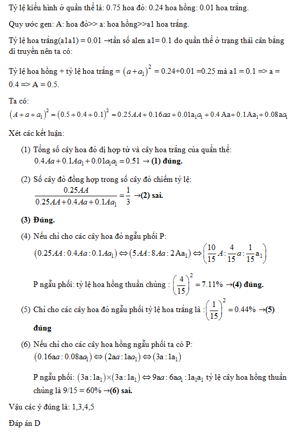 (3). Tần số alen quy định hoa đỏ, hoa hồng, hoa trắng lần lượt là 0.5: 0.4: 0.1