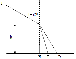 Chiếu chùm sáng trắng hẹp từ không khí vào bể đựng chất lỏng có đáy nằm ngang với góc tới i = 600. Chiết suất của chất lỏng đối với ánh sáng đỏ nđ =1,68 và đổi với ánh sáng tím là nt =1,7. Cho bề rộng của dải màu thu được ở đáy chậu là 1,5cm. Chiều sâu của nước trong bể là: