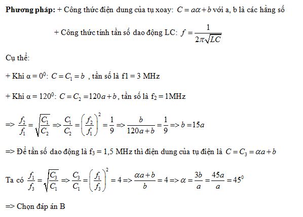 Một mạch dao động gồm cuộn cảm thuần có độ tự cảm xác định và một tụ điện là tụ xoay, có điện dung thay đổi được theo quy luật hàm số bậc nhất của góc xoay α của bản linh động. Khi α=00, tần số dao động riêng của mạch là 3MHz. Khi α=1200, tần số dao động riêng của mạch là 1MHz. Để mạch này có tần số dao động riêng bằng 1,5 MHz thì góc xoay α bằng: