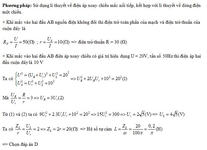 Mạch điện AB gồm một điện trở thuần R mắc nối tiếp với một cuộn dây L. Khi mắc hai đầu A, B vào nguồn điện không đổi thì dòng điện trong mạch là dòng điện một chiều có cường độ 1A. Khi đó hiệu điện thế hai đầu đoạn mạch và hiệu điện thế hai đầu cuộn dây lần lượt là 40V và 10 V. Khi mắc hai đầu A, B vào nguồn điện xoay chiều có tần số f = 50 Hz, giá trị hiệu dụng 20V thì điện áp hiệu dụng hai đầu cuộn dây là 10V. Bỏ qua điện trở của dây nối. Độ tự cảm L của cuộn dây bằng bao nhiêu?