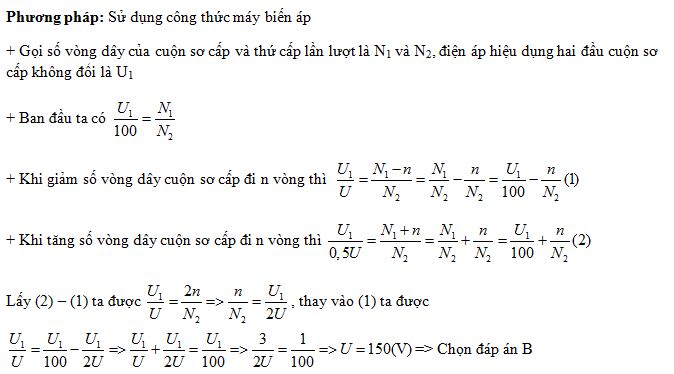 Đặt vào hai đầu cuộn sơ cấp của một máy biến áp lí tưởng một điện áp xoay chiều có điện áp hiệu dụng không đổi thì điện áp hiệu dụng giữa hai đầu mạch thứ cấp khi để hở là 100V. Ở cuộn sơ cấp, khi ta giảm bớt n vòng dây thì điện áp hiệu dụng giữa hai đầu mạch thứ cấp khi để hở là U; nếu tăng n vòng dây ở cuộn sơ cấp thì điện áp hiệu dụng giữa hai đầu mạch thứ cấp khi để hở là U/2. Giá trị của U là: