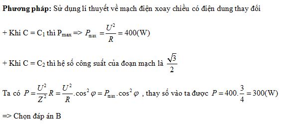 cosωt(V) vào hai đầu đoạn mạch gồm điện trở thuần R, cuộn cảm thuần có độ tự cảm L và tụ điện có điện dung thay đổi được, mắc nối tiếp. Khi C = C1 thì công suất tiêu thụ trên đoạn mạch đạt giá trị cực đại và bằng 400W. Khi C = C2 thì hệ số công suất của đoạn mạch là