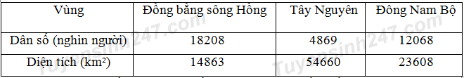Cho bảng số liệu sau DIỆN TÍCH VÀ DÂN SỐ MỘT SỐ VÙNG NƯỚC TA NĂM 2006 (Nguồn: Niên giám