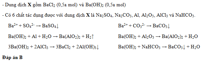 Hoà tan hoàn toàn một lượng Ba vào dung dịch chứa a mol HCl thu được dung dịch X và a mol H2. Trong các chất sau: Na2SO4, Na2CO3,Al, Al2O3, AlCl3, Mg, NaOH và NaHCO3. Số chất tác dụng được với dung dịch X là