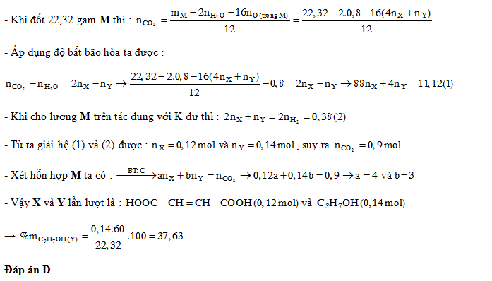 Cho hỗn hợp M gồm hai chất hữu cơ X, Y. Trong đó X là một axít hữu cơ hai chức, mạch hở, không phân nhánh (trong phân tử có một liên kết đôi C=C) và Y là ancol no, đơn chức, mạch hở. Đốt cháy hoàn toàn 22,32 gam M thu được 14,40 gam H2O. Nếu cho 22,32 gam M tác dụng với K dư thu được 4,256 lít H2 (đktc). Phần trăm khối lượng của Y trong M gần nhất với giá trị nào sau đây?