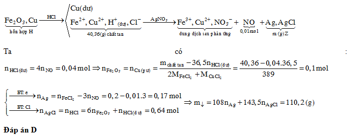Cho hỗn hợp H gồm Fe2O3 và Cu tác dụng hết với dung dịch HCl dư, thu được dung dịch X chứa 40,36g chất tan và một chất rắn không tan. Cho một lượng dư dung dịch AgNO3 vào dung dịch X đến khi phản ứng kết thúc thì thu được 0,01 mol khí NO và m gam kết tủa Z. Biết NO là sản phẩm khử duy nhất của N+5. Giá trị của m là :