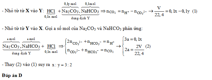 X là dung dịch HCl nồng độ x mol/l. Y là dung dịch gồm Na2CO3 và NaHCO3 có cùng nồng độ y mol/l. Nhỏ từ từ đến hết 100 ml X vào 100 ml Y, thu được V lít khí CO2 (đktc). Nhỏ từ từ đến hết 100 ml Y vào 100 ml X, thu được 2V lít khí CO2 (đktc). Tỉ lệ x : y bằng