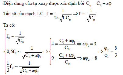 Mạch chọn sóng của máy thu vô tuyến gồm tụ xoay C và cuộn thuần cảm L. Tụ xoay có điện dung C tỉ lệ theo hàm số bậc nhất đối với góc xoay φ. Ban đầu khi chưa xoay tụ thì thì mạch thu được sóng có tần số f0, khi xoay tụ một góc φ1 thì mạch thu được sóng có tần số f1 = 0,5f0. Khi xoay tụ một góc φ2 thì mạch thu được sóng có tần số f1 = 1/3f0. Tỉ số giữa hai góc xoay là: