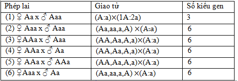 Ở 1 loài thực vật, cho các cây thể ba và cây lưỡng bội giao phấn ngẫu nhiên. Biết các cây thể ba có khả năng giảm phân hình thành giao tử, trong đó hạt phấn (n+1) không có khả năng thụ tinh nhưng noãn (n+1) vẫn có khả năng thụ tinh bình thường. Trong các phép lai sau có bao nhiêu phép lai có thể cho ra 6 loại kiểu gen ở đời con?
