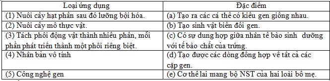 Cho bảng sau đây về đặc điểm của một số hình thức ứng dụng di truyền học trong tạo