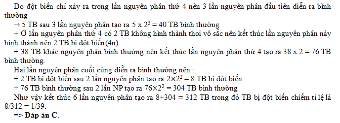 Có 5 tế bào (2n) của một loài cùng tiến hành nguyên phân 6 lần. Ở kỳ giữa của lần nguyên phân thứ 4 có 2 tế bào không hình thành được thoi vô sắc. Ở các tế bào khác và trong những lần nguyên phân khác, thoi vô sắc vẫn hình thành bình thường. Sau khi kết thúc 6 lần nguyên phân đó, tỉ lệ tế bào bị đột biến trong tổng số tế bào được tạo ra là bao nhiêu?