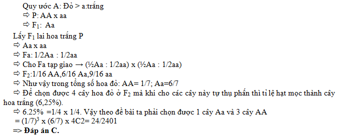 Ở một loài thực vật, tính trạng màu hoa do 1 cặp gen qui định. Cho lai giữa cây hoa đỏ với cây hoa trắng F1 thu được 100% cây hoa đỏ. Cho cây hoa đỏ ở đời F1 lai với cây hoa trắng P thu được Fa. Cho các cây Fa tạp giao với nhau, ở F2 thu được tỉ lệ kiểu hình 56,25% cây hoa trắng: 43,75% cây hoa đỏ. Tính xác suất để chọn được 4 cây hoa đỏ ở F2 mà khi cho các cây này tự thụ phấn thì tỉ lệ hạt mọc thành cây hoa trắng chiếm 6,25%.