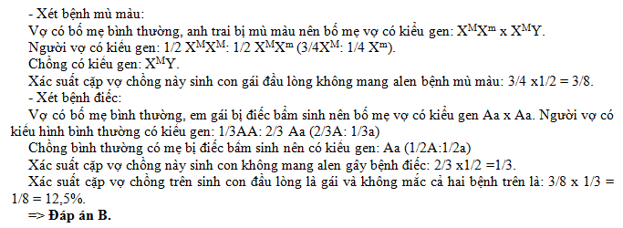 Ở người, bệnh điếc bẩm sinh do alen a nằm trên nhiễm sắc thể thường quy định, alen A quy định tai nghe bình thường; bệnh mù màu do alen m nằm trên vùng không tương đồng của nhiễm sắc thể X quy định, alen M quy định nhìn màu bình thường. Một cặp vợ chồng có kiểu hình bình thường. Bên vợ có anh trai bị mù màu, em gái bị điếc bẩm sinh; bên chồng có mẹ bị điếc bẩm sinh. Những người còn lại trong hai gia đình trên đều có kiểu hình bình thường. Xác suất cặp vợ chồng trên sinh con đầu lòng là gái và không mang alen gây bệnh trên là
