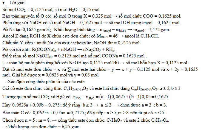 Hỗn hợp X gồm bốn este mạch hở, trong đó có một este đơn chức và ba este hai chức đồng phân. Đốt cháy hết m gam X cần 18,48 lít O2 (đktc), thu được 15,96 lít CO2 (đktc)và 9,9 gam H2O. Đun nóng m gam X với 375 ml dung dịch NaOH 1M, cô cạn dung dịch sau phản ứng thu được chất rắn Y và phần hơi chỉ chứa một ancol Z. Cho toàn bộ Z vào bình đựng Na dư, khi phản ứng xong khối lượng bình tăng 7,3125 gam. Nung toàn bộ Y với CaO (không có không khí), thu được 2,52 lít (đktc) một hiđrocacbon duy nhất. Các phản ứng đều xảy ra hoàn toàn. Khối lượng (gam) của este đơn chức trong X có giá trị là