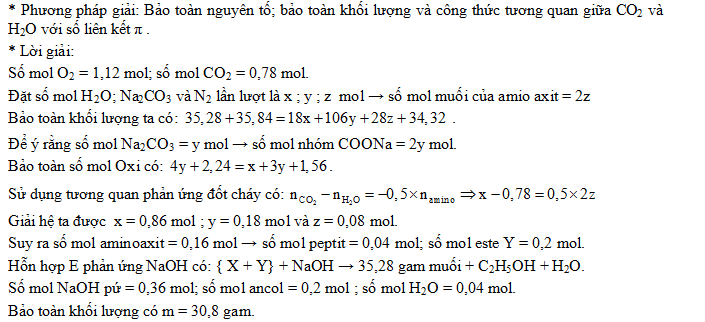 Hỗn hợp E gồm tetrapeptit X (mạch hở, được tạo nên các α-aminoaxit thuộc dãy đồng đẳng của glyxin) và este Y (được tạo nên từ axit cacboxylic no, đơn chức, mạch hở và etanol). Đun nóng m gam E trong dung dịch NaOH vừa đủ, thu được 35,28 gam hỗn hợp muối. Đốt hết lượng muối trên cần 25,088 lít O2 (đktc), thu được H2O, Na2CO3, N2 và 34,32 gam CO2. Các phản ứng xảy ra hoàn toàn. Giá trị của m gần nhất với: