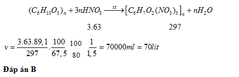 Thể tích dung dịch HNO3 67,5% (khối lượng riêng là 1,5 g/ml) cần dùng để tác dụng với xenlulozơ tạo thành 89,1 kg xenlulozơ trinitrat là (biết lượng HNO3 bị hao hụt là 20%)