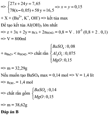 Cho 7,65 gam hỗn hợp Al và Mg tan hoàn toàn trong 500ml dung dịch HCl 1,04M và H2SO4 0,28M thu được dung dịch X và khí H2. Cho 850 ml dung dịch NaOH 1M vào X sau khi các phản ứng xảy ra hoàn toàn thu được 16,5g kết tủa gồm 2 chất. Mặt khác cho từ từ dd hỗn hợp KOH 0,8M và Ba(OH)2 0,1M vào X đến khi thu được lượng kết tủa lớn nhất, lọc kết tủa đem nung đến khối lượng không đổi thu được m gam chất rắn. Giá trị của m gần nhất với giá trị nào sau đây