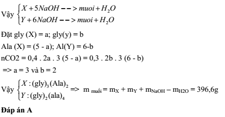Cho 0,7 mol hỗn hợp T gồm 2 peptit mạch hở X (x mol) và Y (y mol) đều tạo bởi glyxin và alanin. Đun nóng 0,7 mol T trong lượng dư dung dịch NaOH thì có 3,8mol NaOH phản ứng và thu được dung dịch chứa m gam muối. Mặt khác, nếu đốt cháy hoàn toàn x mol X hoặc y mol Y thì đều thu được cùng số mol CO2. Biết tổng số nguyên tử oxi trong 2 phân tử X và Y là 13, trong X và Y đều có số liên kết peptit nhỏ hơn 4. Giá trị của m là: