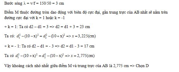 Trong hiện tượng giao thoa sóng nước, hai nguồn kết hợp A,B cách nhau một khoảng a=20 cm dao động điều hòa theo phương thẳng đứng, cùng pha, cùng tần số f=50 Hz. Tốc độ truyền sóng trên mặt nước là 1,5m/s. Xét các điểm trên mặt nước thuộc đường tròn tâm A, bán kính AB. Điểm nằm trên đường tròn dao động với biên độ cực đại cách đường trung trực của AB một khoảng ngắn nhất là: