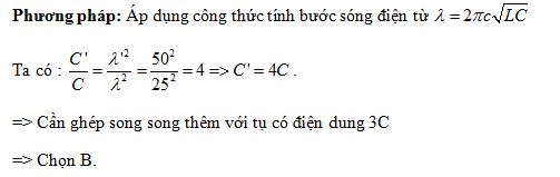 Mạch dao động của máy thu sóng vô tuyến có tụ điện với điện dung C và cuộn cảm với độ tự cảm L, thu được sóng điện từ có bước sóng 25 m. Để thu được sóng điện từ có bước sóng 50 m, người ta phải mắc song song với tụ điện của mạch dao động trên tụ điện có điện dung C' bằng
