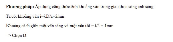 Trong một thí nghiệm Y−âng về giao thoa ánh sáng, khoảng cách giữa hai khe là a = 0,5 mm, khoảng cách từ mặt phẳng chứa hai khe đến màn quan sát là D = 2 m. Nguồn sáng phát ra ánh sáng đơn sắc có bước sóng 0,5 µm. Trên màn khoảng cách giữa một vân sáng và một vân tối cạnh nhau bằng