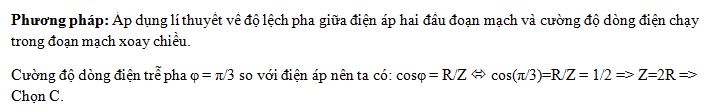 Đặt điện áp xoay chiều ổn định u = U0cosωt vào hai đầu đoạn mạch gồm cuộn dây thuần cảm và điện trở thuần R thì cường độ dòng điện qua mạch trễ pha π/3so với điện áp hai đầu mạch. Tổng trở của đoạn mạch bằng