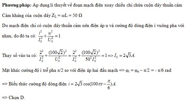 Đặt điện áp xoay chiều u = U0cos(100πt + π/3) V vào hai đầu một cuộn cảm thuần có độ tự cảm L = 1/2π H. Ở thời điểm điện áp giữa hai đầu cuộn cảm là u=100