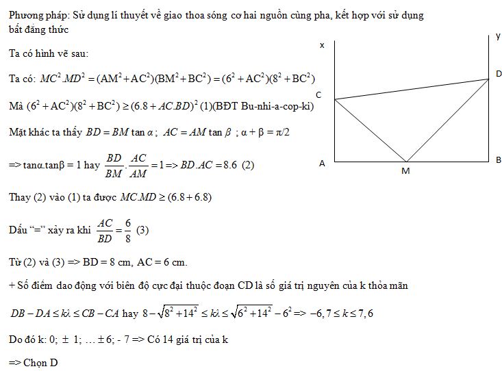 Tại mặt nước, hai nguồn kết hợp được đặt ở A và B cách nhau 14 cm, dao động điều hòa cùng tần số, cùng pha, theo phương vuông góc với mặt nước. Sóng truyền trên mặt nước với bước sóng 1,2 cm. Điểm M nằm trên đoạn AB cách A một đoạn 6 cm. Ax, By là hai nửa đường thẳng trên mặt nước, cùng một phía so với AB và vuông góc với AB. Cho điểm C di chuyển trên Ax và điểm D di chuyển trên By sao cho MC luôn vuông góc với MD. Khi diện tích của tam giác MCD có giá trị nhỏ nhất thì số điểm dao động với biên độ cực đại có trên đoạn CD là
