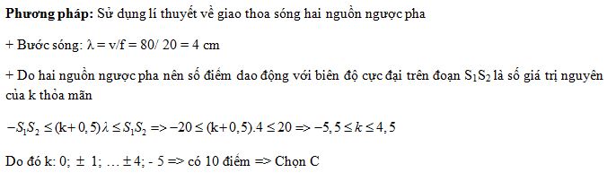 Ở bề mặt một chất lỏng có hai nguồn phát sóng kết hợp S1 và S2 cách nhau 20 cm. Hai nguồn này dao động theo phương thẳng đứng có phương trình lần lượt là u1 = 2cos40πt (mm) và u2 = 2cos(40πt + π) (mm). Tốc độ truyền sóng trên mặt chất lỏng là 80 cm/s. Số điểm dao động với biên độ cực đại trên đoạn thẳng S1S2 là