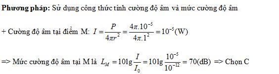 Nguồn âm S phát ra âm có công suất P = 4π.10-5 W không đổi, truyền đẳng hướng về mọi phương. Cho cường độ âm chuẩn I0 = 10-12 W/m2. Điểm M cách nguồn S một đoạn 1m có mức cường độ âm là