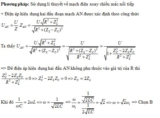 Đặt điện áp u = U cosωt vào hai đầu đoạn mạch AN và NB mắc nối tiếp. Đoạn AN gồm biến trở R mắc nối tiếp với cuộn cảm thuần có độ tự cảm L, đoạn NB chỉ có tụ điện với điện dung C. Đặt . Để điện áp hiệu dụng giữa hai đầu đoạn mạch AN không phụ thuộc R thì tần số góc ω bằng