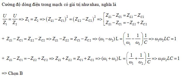 Đặt điện áp xoay chiều u = U0cosωt (V) có ω thay đổi được vào hai đầu đoạn mạch có R, L, C mắc nối tiếp. Thay đổi ω thì khi ω = ω1 hay ω = ω2 thì cường độ dòng điện hiệu dụng trong mạch như nhau. Hệ thức đúng là