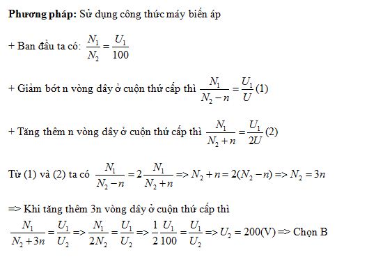 Đặt vào hai đầu cuộn sơ cấp của một máy biến áp lí tưởng(bỏ qua hao phí) một điện áp xoay chiều có giá trị hiệu dụng không đổi thì điện áp hiệu dụng hai đầu cuộn thứ cấp để hở là 100 V. Ở cuộn thứ cấp, nếu giảm bớt n vòng dây thì điện áp hiệu dụng giữa hai đầu để hở của nó là U, nếu tăng thêm n vòng dây thì điện áp đó là 2U. Nếu tăng thêm 3n vòng dây ở cuộn thứ cấp thì điện áp hiệu dụng giữa hai đầu để hở của cuộn này bằng