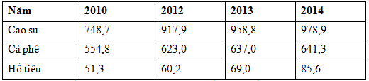 Cho bảng số liệu Diện tích gieo trồng cao su, cà phê, hồ tiêu nước ta (Đơn vị: nghìn