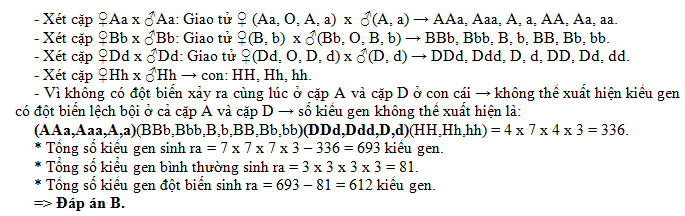 Cho phép lai (P): ♀AaBbDdHh x ♂AaBbDdHh. Biết rằng: 8% số tế bào sinh tinh có cặp nhiễm sắc thể mang cặp gen Bb không phân ly trong giảm phân I, các cặp nhiễm sắc thể khác phân ly bình thường, giảm phân II bình thường, các tế bào sinh tinh khác giảm phân bình thường; 20% số tế bào sinh trứng có cặp nhiễm sắc thể mang cặp gen Dd không phân ly trong giảm phân I, các cặp nhiễm sắc thể khác phân ly bình thường, giảm phân II bình thường; 16% số tế bào sinh trứng có cặp nhiễm sắc thể mang cặp gen Aa không phân ly trong giảm phân I, các cặp nhiễm sắc thể khác phân ly bình thường, giảm phân II bình thường, các tế bào sinh trứng khác giảm phân bình thường; các giao tử có sức sống và khả năng thụ tinh ngang nhau. Số loại kiểu gen đột biến tối đa có thể thu được ở F1 là