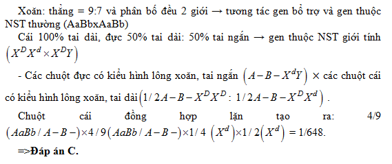Ở chuột, khi lai giữa một cặp bố mẹ đều thuần chủng và mang kiểu gen khác nhau, người ta thu được F1 đồng loạt lông xoăn, tai dài. Cho F1 giao phối với nhau, ở F2 xuất hiện kết quả như sau:Chuột cái: 108 con lông xoăn, tai dài; 84 con lông thẳng, tai dài.Chuột đực: 55 con lông xoăn, tai dài; 53 con lông xoăn, tai ngắn; 43 con lông thẳng, tai ngắn: 41 con lông thẳng, tai dài.Biết tính trạng kích thước tai do 1 cặp gen qui định. Nếu cho các chuột đực có kiểu hình lông xoăn, tai ngắn và các chuột cái có kiểu hình lông xoăn, tai dài ở F2 ngẫu phối thì tỉ lệ chuột cái đồng hợp lặn về tất cả các cặp gen thu được ở đời con là bao nhiêu?