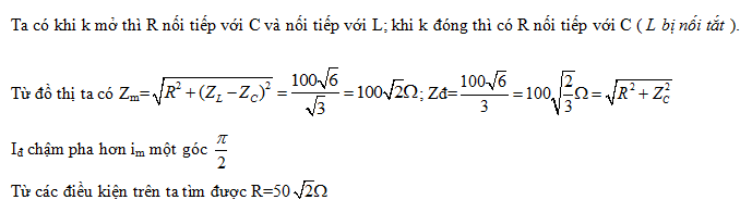 . Khi K mở hoặc đóng,thì đồ thị cường độ dòng điện qua mạch theo thời gian tương ứng là im và iđ được biểu diễn như hình bên. Điện trở các dây nối rất nhỏ. Giá trị của R bằng