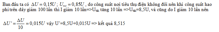 Trong quá trình truyền tải điện năng đi xa cần tăng điện áp hiệu dụng của nguồn lên bao nhiêu lần để giảm công suất hao phí trên đường dây đi 100 lần. Giả thiết công suất nơi tiêu thụ nhận được không đổi,điện áp tức thời u cùng pha với dòng điện tức thời i. Biết ban đầu độ giảm điện thế trên đường dây bằng 15% điện áp hiệu dụng của tải tiêu thụ.