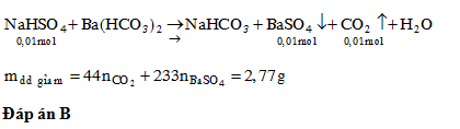 Hòa tan hết 0,01 mol NaHSO4 vào dung dịch chứa Ba(HCO3)2 dư kết thúc phản ứng thấy khối lượng