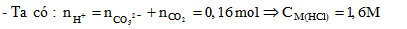 Cho từ từ từng giọt đến hết 100 ml dung dịch HCl aM vào 100 ml dung dịch Na2CO3 1M, thấy thoát ra