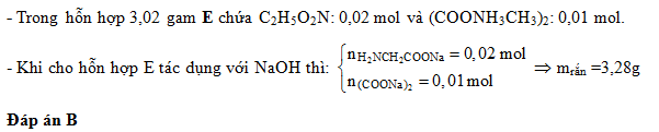 Hỗn hợp E chứa Gly và một hợp chất hữu cơ có công thức phân tử C4H12O4N2 tỷ lệ mol tương ứng là 2:1. Cho 3,02 gam E tác dụng (vừa đủ) với dung dịch chứa NaOH. Cô cạn dung dịch sau phản ứng thu được m gam rắn khan gồm hỗn hợp 2 muối và một chất khí là chất hữu cơ có khả năng làm xanh giấy quỳ ẩm. Giá trị của m có thể là: