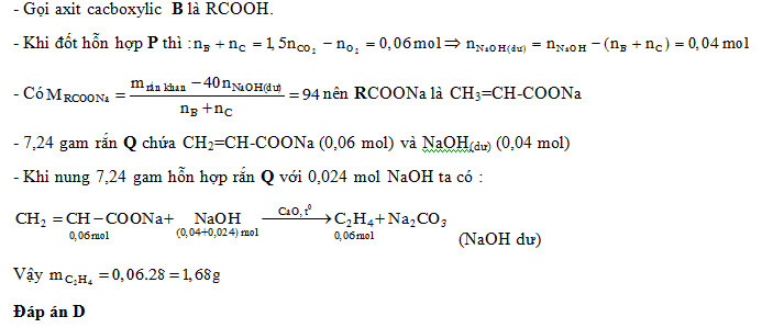 Hỗn hợp P gồm ancol A, axit cacboxylic B (đều no, đơn chức, mạch hở) và este C tạo ra từ A và B. Đốt cháy hoàn toàn m gam P cần dùng vừa đủ 0,36 mol O2, sinh ra 0,28 mol CO2. Cho m gam P trên vào 250 ml dung dịch NaOH 0,4M đun nóng, sau khi kết thúc các phản ứng thu được dung dịch Q. Cô cạn dung dịch Q còn lại 7,24 gam chất rắn khan. Người ta cho thêm bột CaO và 0,96 gam NaOH vào 7,24 gam chất rắn khan trên rồi nung trong bình kín không có không khí đến phản ứng hoàn toàn thu được a gam khí. Giá trị a gần nhất với ?
