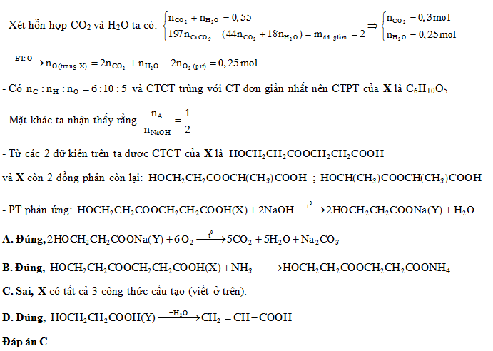 Chất hữu cơ mạch hở X có công thức phân tử trùng với công thức đơn giản nhất. Đốt cháy hoàn toàn m gam X cần vừa đủ 6,72 lít O2 (đo ở đktc), thu được 0,55 mol hỗn hợp gồm CO2 và H2O. Hấp thụ hết sản phẩm cháy vào 200 ml dung dịch Ba(OH)2 1M, sau phản ứng khối lượng phần dung dịch giảm bớt 2 gam. Cho m gam X tác dụng vừa đủ với 0,1 mol NaOH, thu được 0,9 gam H2O và một chất hữu cơ Y. Phát biểu nào sau đây sai?