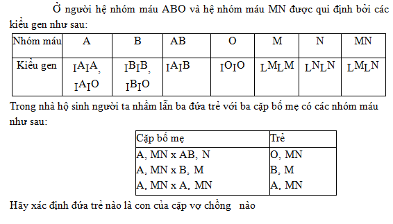 Xét đứa trẻ thứ 1 (O, MN) có nhóm máu O nên không thể là con của cặp vợ chồng 1 (A, MN x AB, N)→ đứa trẻ 1 là con cặp vợ chồng 3 , đứa trẻ 3 là con của vợ chồng 1.