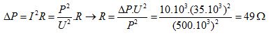 Người ta truyền một công suất 500 kW từ một trạm phát điện đến nơi tiêu thụ bằng đường dây một pha. Biết công suất hao phí trên đường dây là 10 kW, điện áp hiệu dụng ở trạm phát là 35 kV. Coi hệ số công suất của mạch truyền tải điện bằng 1. Điện trở tổng cộng của đường dây tải điện là